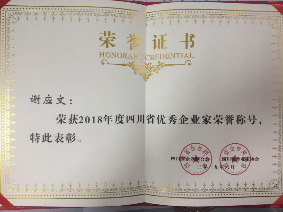 謝應文董事長因其突出的業績與貢獻,先后榮獲“全國企業文化建設突出貢獻人物”,“西南國防動員建設十佳個人”,“四川省抗震救災先進個人”等榮譽稱號,2018年當選成都市第十三屆人民代表大會代表。
