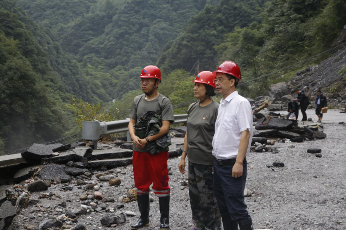 21日大邑縣縣委書記李燎等領導現場查看道路損毀情況