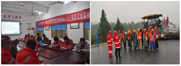 本次試驗(yàn)段鋪筑在K48+570-K48+940,全長(zhǎng)370m。為了成功完成試驗(yàn)段鋪筑工作,項(xiàng)目部精心組織,科學(xué)籌劃,專門成立試驗(yàn)段鋪筑管理小組,細(xì)化施工方案,明確人員分工。提前召開施工技術(shù)交底會(huì),班前安全教育,從攤鋪、碾壓、運(yùn)輸車輛運(yùn)輸、施工溫度控制、人員組織等各個(gè)方面詳細(xì)交代,確保試驗(yàn)段一次性成功鋪筑。